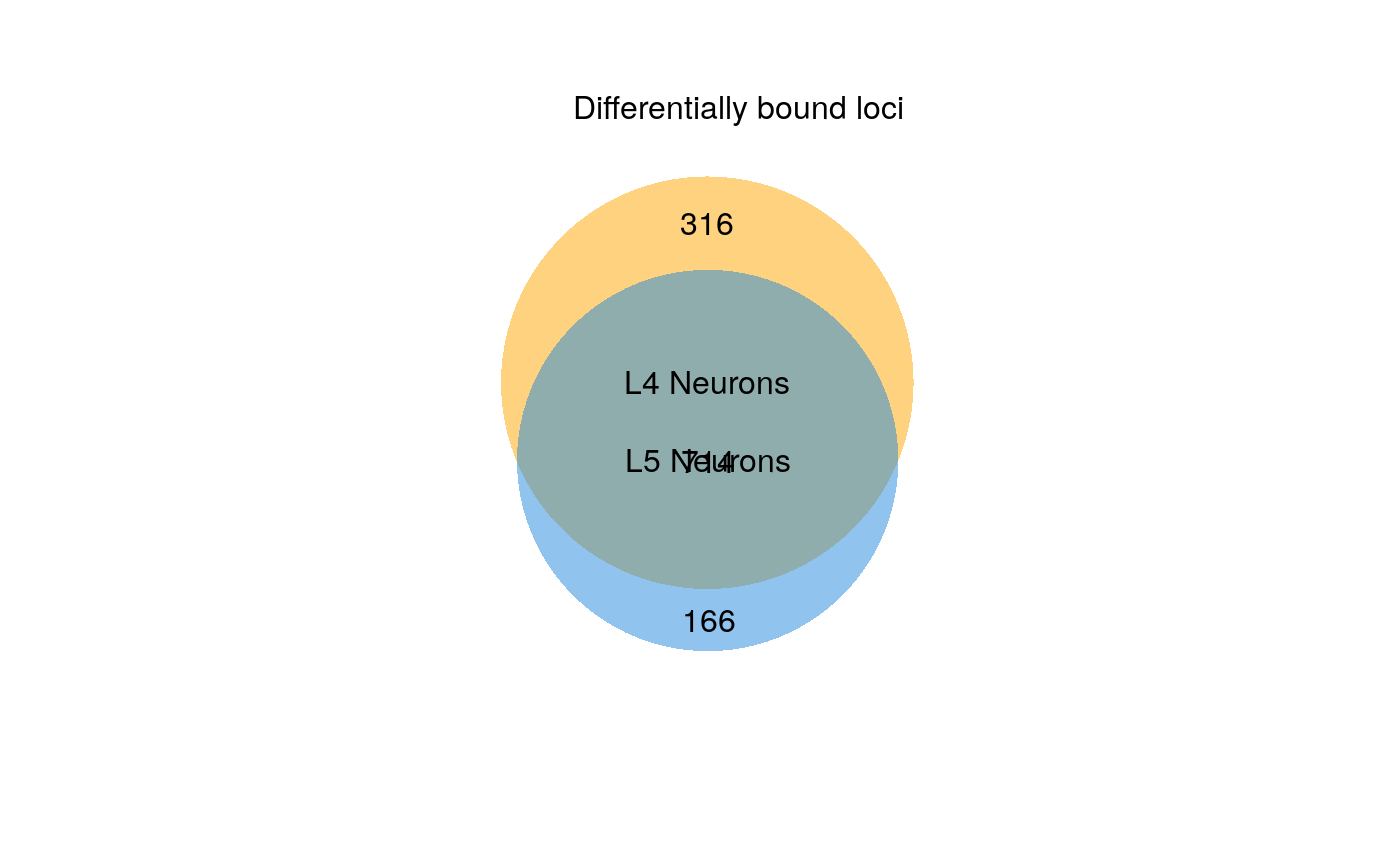 plot_venn.RdGenerates a two-set proportional Venn diagram summarising the results of the differential binding analysis. The set union represents significant binding peaks that fail to show significant differences in occupancy; the exclusive regions of each set represent regions with enriched differential binding in that condition. Note that regions can be bound in both conditions, and still show differential occupancy. For gene expression analysis, the set of analysed genes can optionally be filtered by FDR such that the universe is restricted to only genes deemed expressed, as is typically expected for DEG representations.